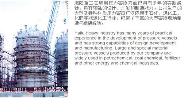 蘇州海陸重工股份有限公司位于江蘇省張家港市開發(fā)區(qū),是國內(nèi)一流的節(jié)能環(huán)保設(shè)備的專業(yè)設(shè)計制造企業(yè),目前并已初步形成鍋爐產(chǎn)品、大型壓力容器、核電設(shè)備、低溫產(chǎn)品、環(huán)保工程共同發(fā)展的業(yè)務格局。公司創(chuàng)建于1956年,注冊資本51640萬元,占地面積近50萬平米。公司下設(shè)八個控股子公司,一個余熱鍋爐研究所,在瑞士、北京、武漢、南京、上海、杭州、廣州等地設(shè)立分支機構(gòu),擁有雄厚的研發(fā)實力。公司秉承“科技領(lǐng)航、業(yè)界先鋒”的發(fā)展理念,注重研究廢熱、余熱利用和環(huán)境保護相結(jié)合的新技術(shù)研發(fā),自主設(shè)計能力居同行前列;公司承擔過國家863計劃,江蘇省科技成果轉(zhuǎn)化專項資金,榮獲國家科技進步二等獎,產(chǎn)品擁有核心自主知識產(chǎn)權(quán)并取得專利50多項;公司推行國際先進的管理體系標準和認證,擁有 A級鍋爐制造許可證,A1、A2、A3級壓力容器設(shè)計和制造許可證,取得了民用核承壓設(shè)備制造資格許可證、美國機械工程師學會(ASME)“S”、“U”鋼印,通過了ISO9001質(zhì)量體系認證、健康體系認證和14000環(huán)境體系認證;公司設(shè)備先進,裝備精良,專業(yè)嚴謹?shù)闹圃炖砟畲蛟斐銎焚|(zhì)非凡、質(zhì)量一流的“海陸”品牌聲譽。